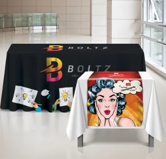 Revitalize your display tables with our vivid, full-color table drapes, designed to create a memorable first impression at trade shows, exhibitions, or your next event. Tailored to perfection, each piece is a canvas that reflects your brand’s uniqueness and commitment to excellence.
